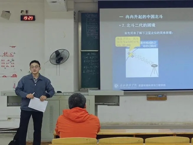 王老师又给同学们讲解了卫星定位的简单原理,让同学们进一步了解了北斗二代的发展困境。对于中国、以及每个人,挑战与机遇都是并存的,在困境中我们也要逆流而上,必须做到自主可控。创新才是北斗系统建设的唯一出路。同时他也希望同学们在感叹无数的“筑梦人”呕心沥血才让北斗导航系统抢占到了空间国土的同时,也清楚地知道,国际环境复杂,新时代青年更应该努力学习科学知识,为中华民族的伟大复兴献出自己的力量。